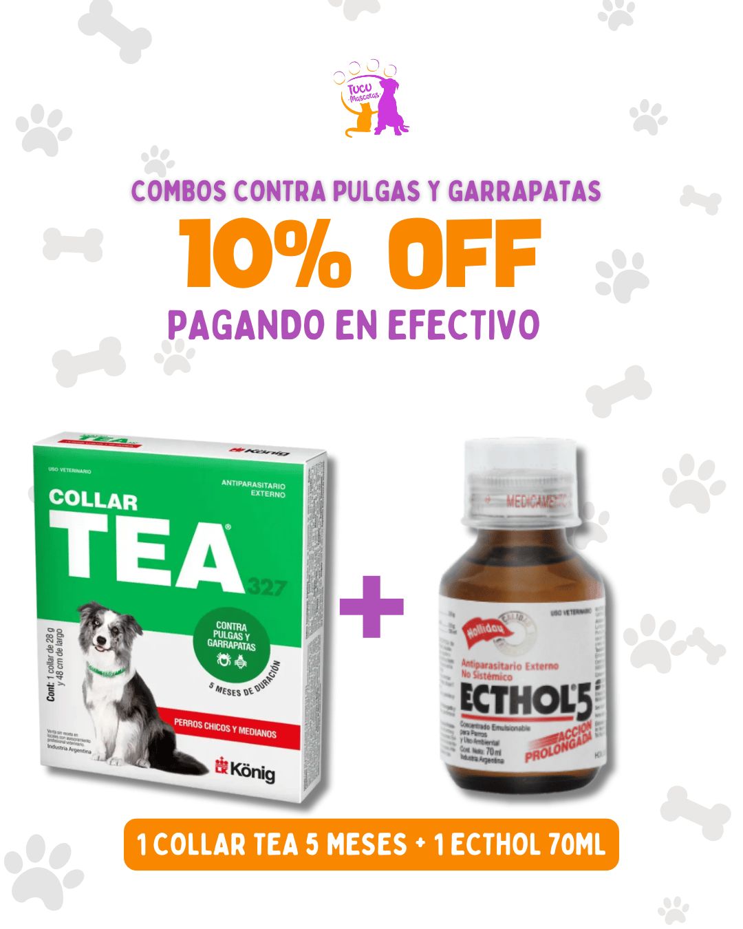 Mantené a tu mascota protegida con este pack que incluye 1 Collar TEA (efectivo contra pulgas y garrapatas con hasta 5 meses de duración) + 1 Ecthol 70 ml (antiparasitario externo de acción prolongada).