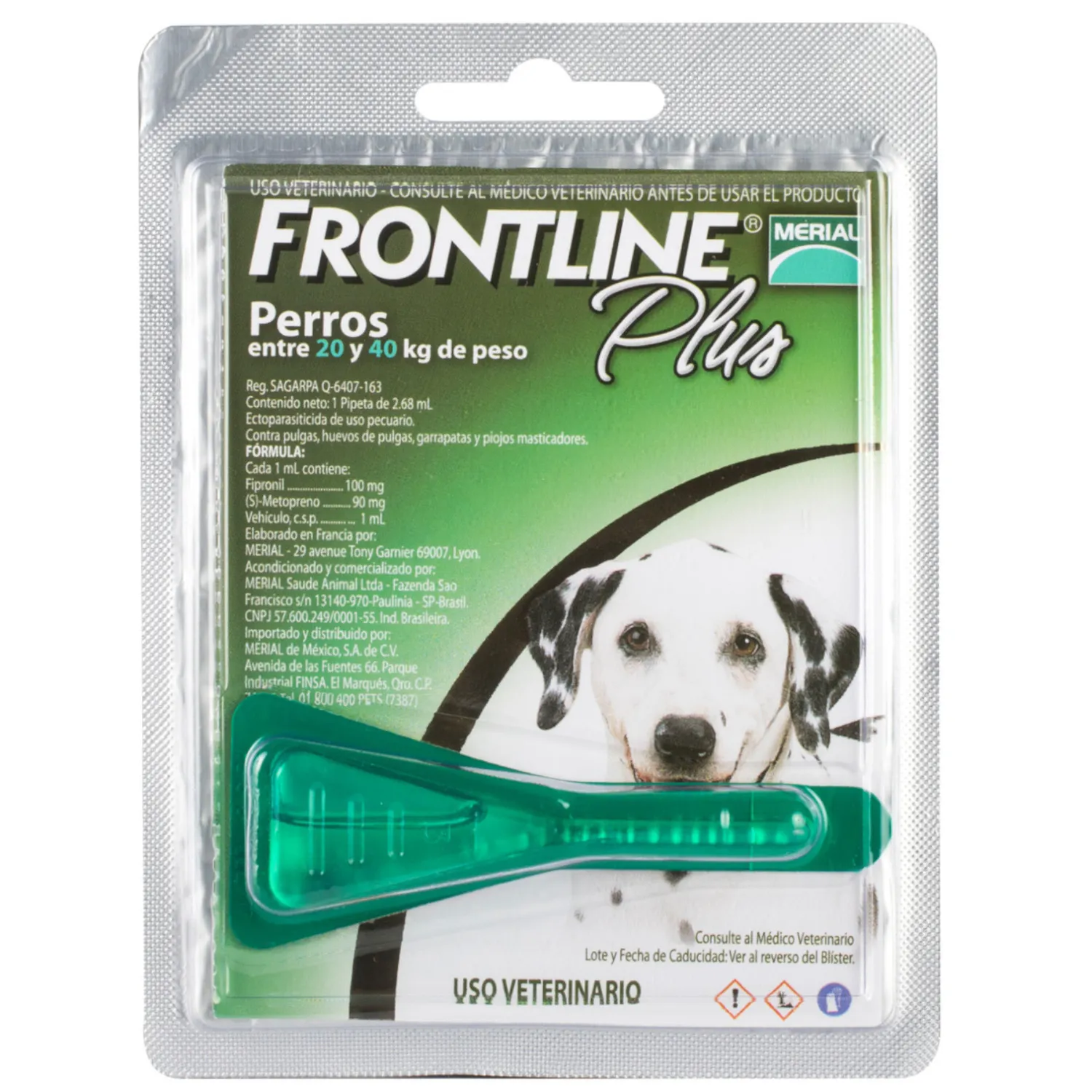 Frontline Plus Perro es un antiparasitario externo para perros entre los 40 kg indicado para el tratamiento y prevención de pulgas, garrapatas y piojos masticadores. También elimina formas inmaduras de pulgas (huevos y larvas) de tu hogar, evitando que el ciclo de vida de la pulga continúe. Ayuda en el control de la sarna sarcóptica en perros. Puede ser utilizado en cachorros con más de 8 semanas de vida o peso superior a 2 kg y en hembras gestantes o en período de lactancia. La forma de aplicación del producto es de manera externa.