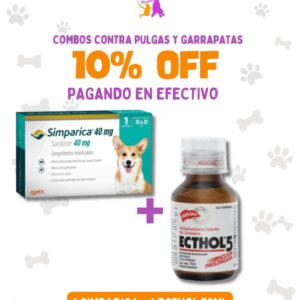 Protegé a tu mascota con este combo especial que incluye 1 Simparica (pipeta antiparasitaria externa para perros de 10 a 20kg) + 1 Ecthol 70 ml (antiparasitario externo de acción prolongada).